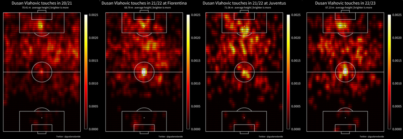 You see here that the average height of touches for Vlahović didn’t change much over time. Of course, you could argue that 2 to 3 meters are important in a game of randomness and complexity like football.