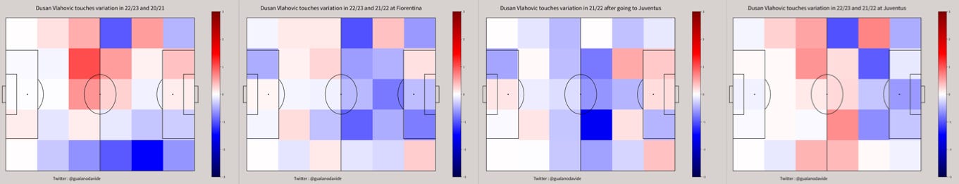 The first season mentioned in the title is the one that is compared to the second. So for example, and to sum all the things up we can see in the first and in the fourth graph how Vlahović - this season - touches between 0 and 1 times more in the middle third of the pitch than in the 20/21 season at Fiorentina and the half of last season played at Juventus.