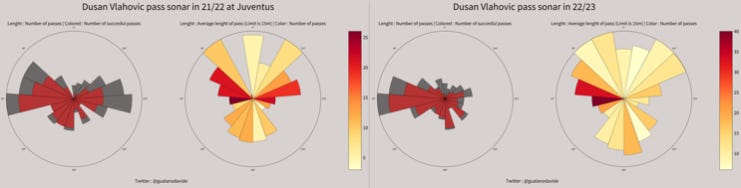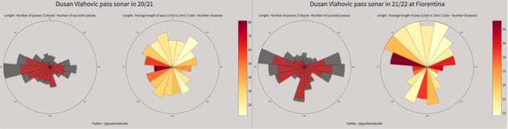 You see two radars for every season. Every single left radar, makes you see the number of passes and the number of successful passes for the angle. On the right one instead, you see the average length for the angle of passes - with the limit being 15m - while the color indicates the number of passes for that angle. We can notice a couple of things, Vlahović always missed a lot of passes, but Vlahović always connected a lot of passes only with the wingers.